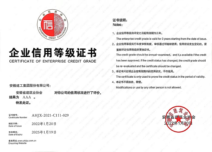 安徽建工集團作為省屬大型國有上市企業(yè),秉承“創(chuàng)造空間藝術(shù),成就人文生活”的企業(yè)使命,堅守“誠信為本、敬業(yè)至上”的企業(yè)核心價值觀,恪守“重合同、守信譽”和“質(zhì)量第一、用戶至上”服務(wù)宗旨,強化信用體系建設(shè),加強項目履約管理,樹立良好品牌形象。此次獲評AAA級信用企業(yè),是繼中國建筑業(yè)協(xié)會“建筑業(yè)AAA級信用企業(yè)” “中企聯(lián)2020年第一批AAA級信用企業(yè)”“中國承包商80強”“納稅信用A級納稅人”后的誠信體系建設(shè)又一新成果。