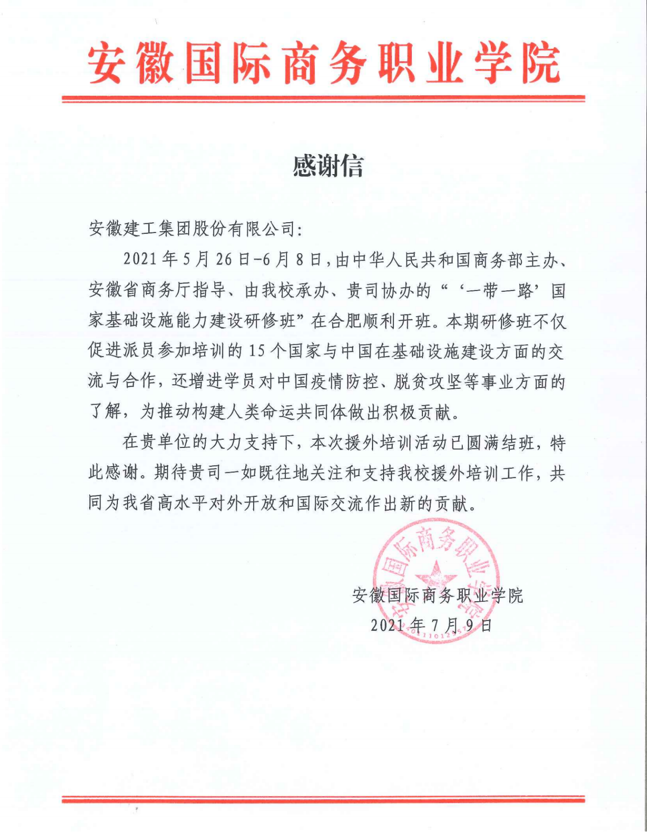 7月9日,安徽集團(tuán)股份有限公司海外事業(yè)部收到安徽國(guó)際商務(wù)職業(yè)學(xué)院來(lái)信,對(duì)集團(tuán)在2021年度“一帶一路”國(guó)家基礎(chǔ)設(shè)施能力建設(shè)研修班舉辦過(guò)程中給予的大力支持表示感謝。