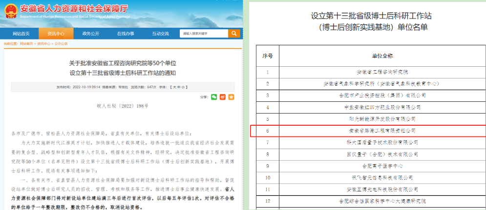 近日,安徽省人力和資源保障廳發(fā)布了《第十三批省級博士后科研工作站(博士后創(chuàng)新實(shí)踐基地)名單》(皖人社秘〔2022〕198號(hào)),集團(tuán)所屬安徽省路港工程有限責(zé)任公司成功獲批省級博士后科研工作站,自此集團(tuán)公司博士后工作站規(guī)模達(dá)3個(gè),標(biāo)志著集團(tuán)公司在高水平科學(xué)研究、高層次人才培養(yǎng)方面又取得了重大突破。