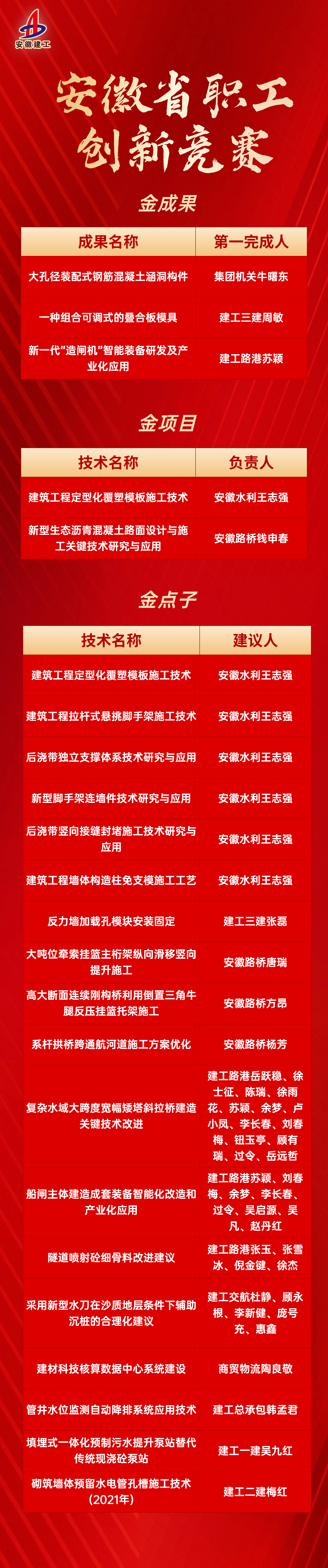 近日,從安徽省總工會傳來好消息,安徽建工集團3項“金成果”、2項“金項目”、20項“金點子”喜獲省職工技術創(chuàng)新競賽獎。
