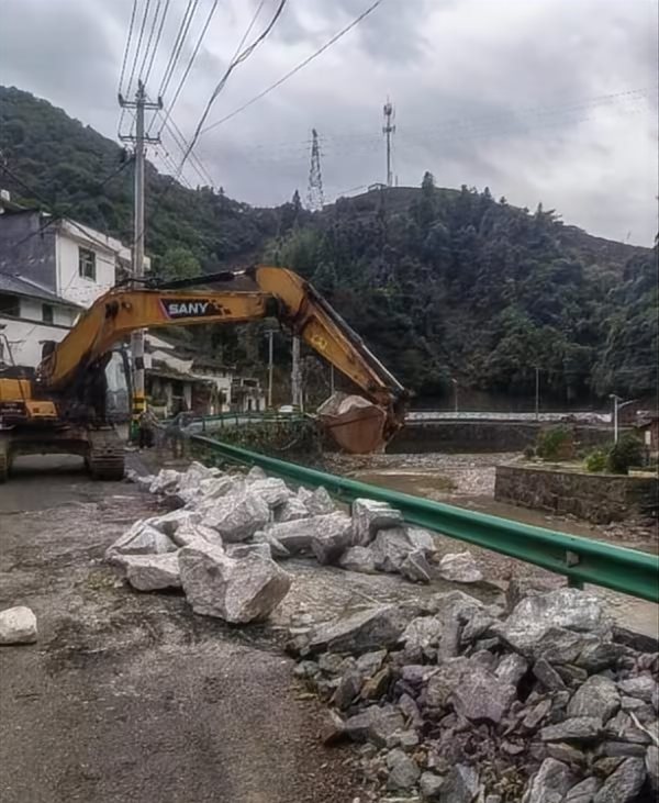 6月22日上午,救援隊緊急趕往下一個受災嚴重的區(qū)域——黃山徽州區(qū)富溪鄉(xiāng)光明村,碣石村、富溪村、福州村,展開應急搶險救助;應急搶險隊包括50名員工,其中9名黨員,三臺大型挖機設備,兩臺大型鏟運車,開展對富溪鄉(xiāng)范圍內四個村寨受災居民房屋、河道內洪水淤積泥沙清理;對046縣道長塢段沿河道邊坡坍塌組裝鋼筋籠拋石護坡,對山體滑坡碎石、山體滑坡致受阻道路泥漿清理等搶險工作。