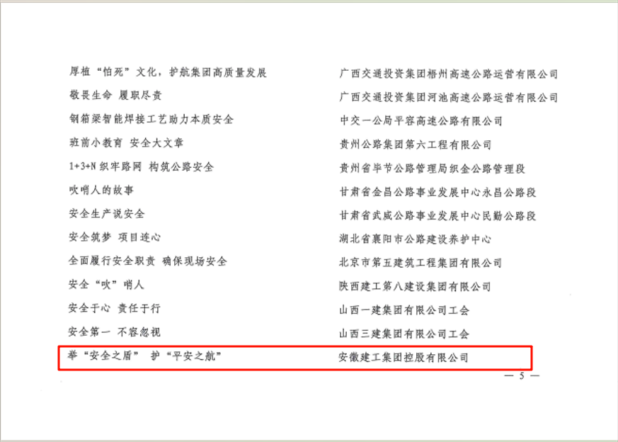 近期,中國海員建設(shè)工會(huì)全國委員會(huì)通報(bào)了2024年全國交通建設(shè)系統(tǒng)“安康杯”競賽安全管理60項(xiàng)優(yōu)秀成果,由集團(tuán)公司和建工三建共同制作的視頻作品《舉“安全之盾” 護(hù)“平安之航”》,從全國交通建設(shè)系統(tǒng)的253項(xiàng)成果中脫穎而出,獲評(píng)“安康杯”競賽安全管理優(yōu)秀成果。