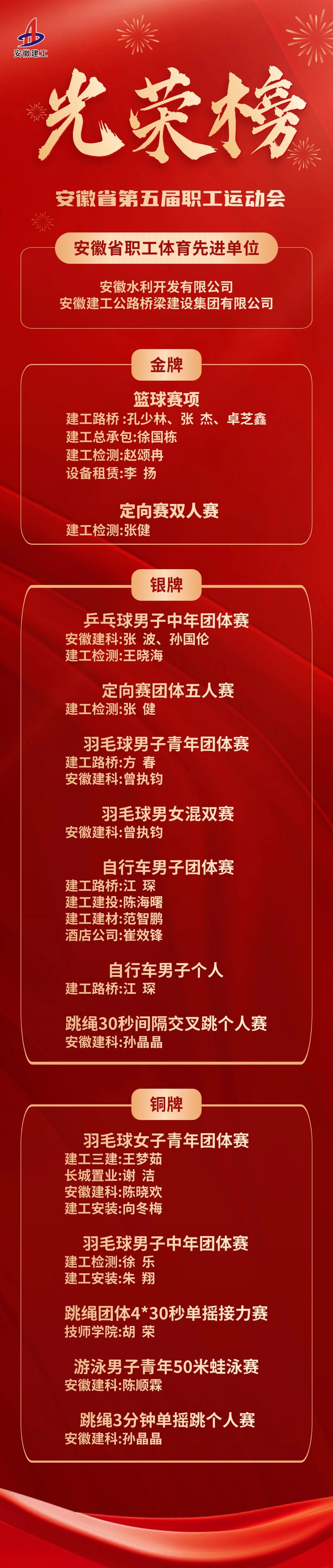 在剛剛閉幕的安徽省第五屆職工運(yùn)動(dòng)會(huì)上,安徽建工選派81名選手參加了籃球、工間操、中國(guó)象棋、定向賽等12項(xiàng)體育賽事,并承辦全省住建系統(tǒng)3個(gè)賽項(xiàng)的參賽組織工作。在激烈的角逐中,建工健兒奮勇爭(zhēng)先、捷報(bào)頻傳,74名選手榜上有名,斬獲2金7銀5銅良好佳績(jī),安徽水利、建工路橋獲評(píng)安徽省職工體育先進(jìn)單位,綜合成績(jī)處于全省第一方陣。